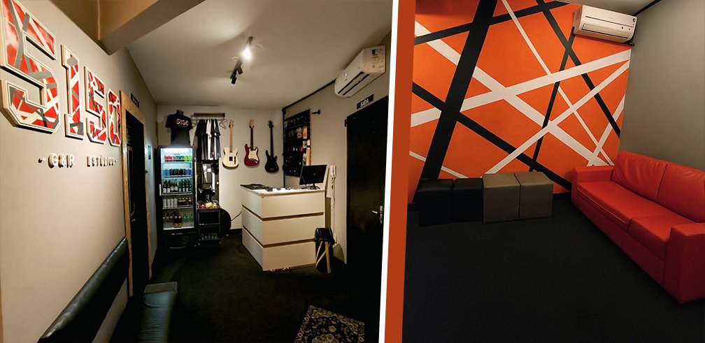 Enquanto você aguarda sua vez ou faz uma pausa entre os ensaios, pode relaxar confortavelmente, conferir nossas camisetas exclusivas ou até dar uma olhada nos instrumentos e itens disponíveis para venda.